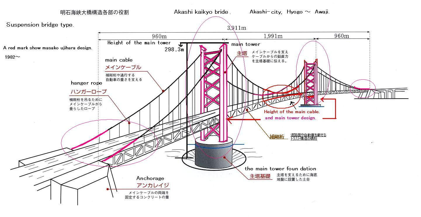 Jembatan gantung dengan banyak perubahan perencanaan dan yang merupakan hasil riset berpuluh-puluh tahun, untuk daerah gempa di Selat Akashi. Menara-menara jembatan berada di dalam air berkedalaman 35 m (115 kaki) yang berjeram kuat. Usulan tahun 1986 ini, yang sedang dibangun pada saat penulisan buku ini (1988), merupakan jembatan terpanjang di dunia, yaitu 1990 m (6.500 kaki), dengan rentang-samping 960 m, dan menara-menara yang pada rencana awalnya hanya setinggi 333 m (1090 kaki). Tinggi menara mungkin akan dikurangi menjadi sekitar 300 m. Jalan kereta api yang semula direncanakan, tidak jadi dibangun di atasnya.